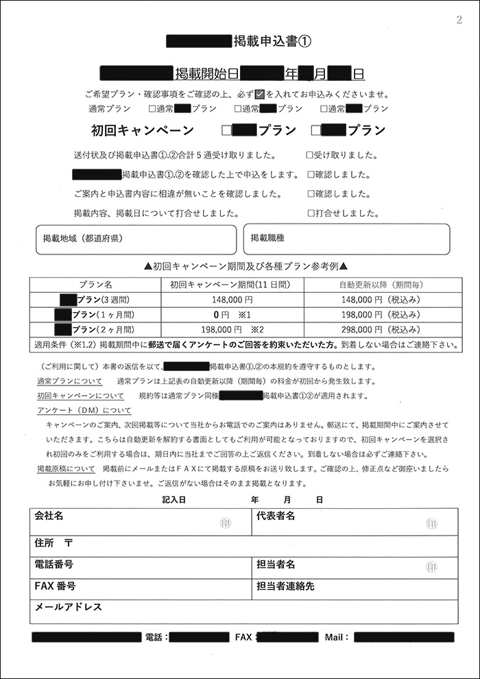 被害者が興味を示すと、メールやFAX等で無料キャンペーンの申込書等が送られてきます。電話とメール・FAXで契約が進んでいき、対面での打ち合わせや説明などは行われないのが特徴です。